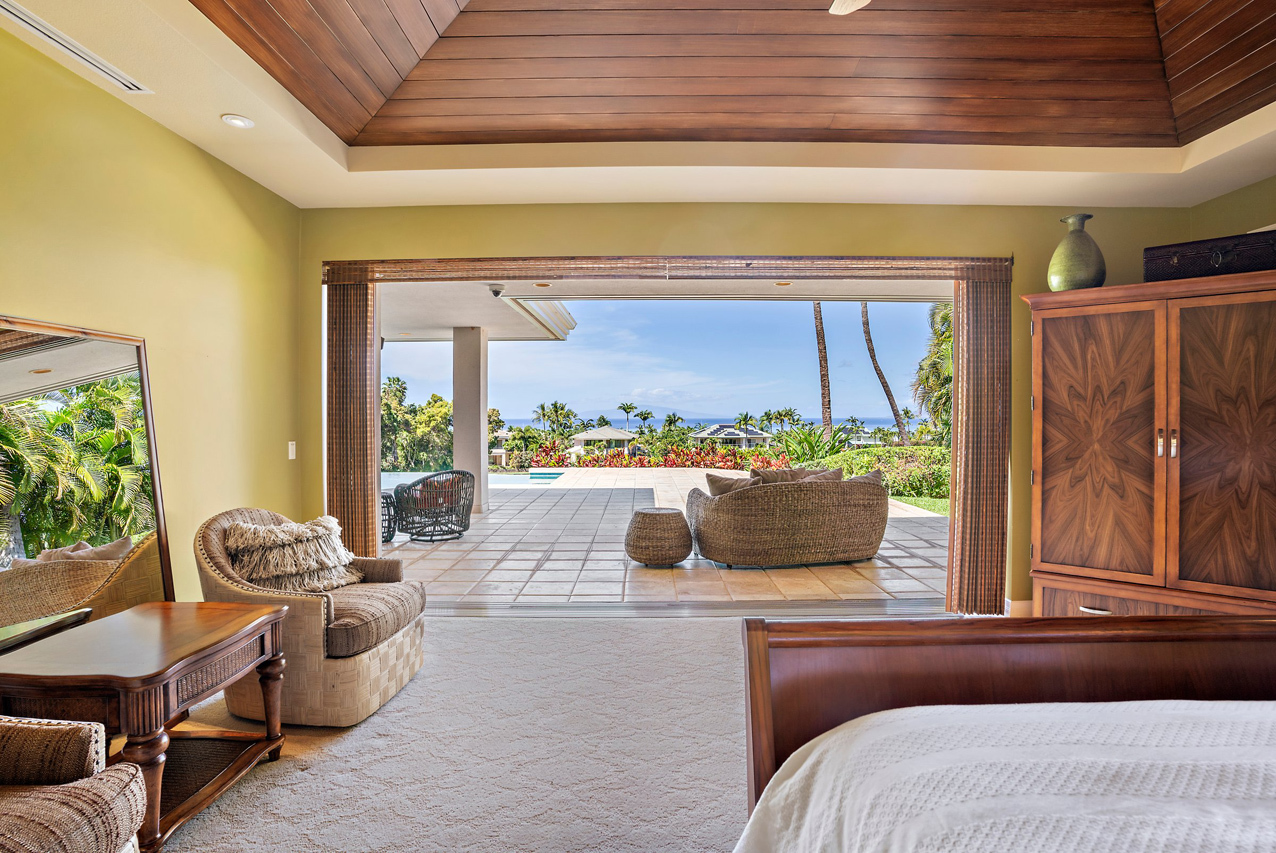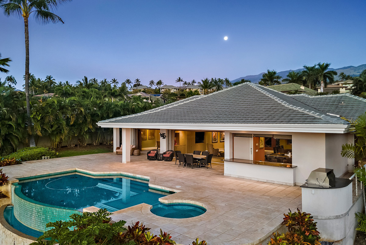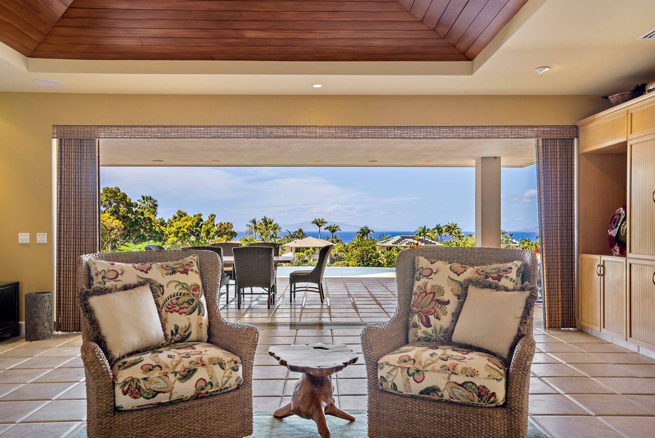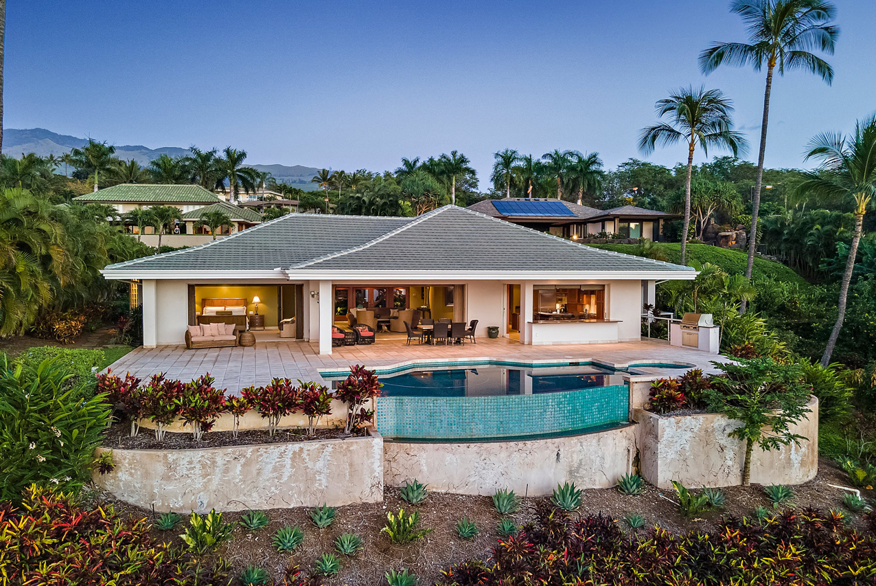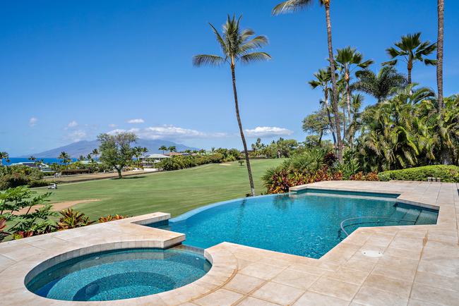 256 Noho Like Way in Wailea Highlands offers you the rare opportunity to savor Wailea living raised to a higher elevation. This single-level, 4 bedroom home has graceful architecture designed to embrace the panoramic ocean views and create a relaxing retreat-like atmosphere. Greet the morning by walking out from your master suite onto the spacious, 600sqft lanai to take a refreshing swim in the infinity-edge pool and marvel at the views of the ocean, West Maui mountains and fairways of the pristine Wailea golf course. Lanai is perfectly oriented to enjoy sunset views year round and ample roof coverage over the lanai means you can enjoy the outdoors all day long. This private and peaceful half-acre estate is adorned with verdant tropical landscaping and features an elegant entry courtyard graced with impressive carved wood double front doors with a beautiful tree motif. The grand living room has high vaulted ceilings and features a large-panel retracting pocket door to seamlessly connect with the covered outdoor dining area on the lanai. Each of the four bedrooms feels like its own private retreat with ensuite bath, spacious layout, plush island-style furnishings and lanai access. Kitchen features timeless plantation-style cabinetry, granite countertops, a gas range, stainless steel appliances. This Iconic Setting is famous around the world for its pristine weather and access to the best lifestyle in Hawaii. Nearby are all of Wailea's many amenities, including first-class restaurants, 3 championship golf courses, tennis facilities, and miles of white sand beaches and ocean recreation.