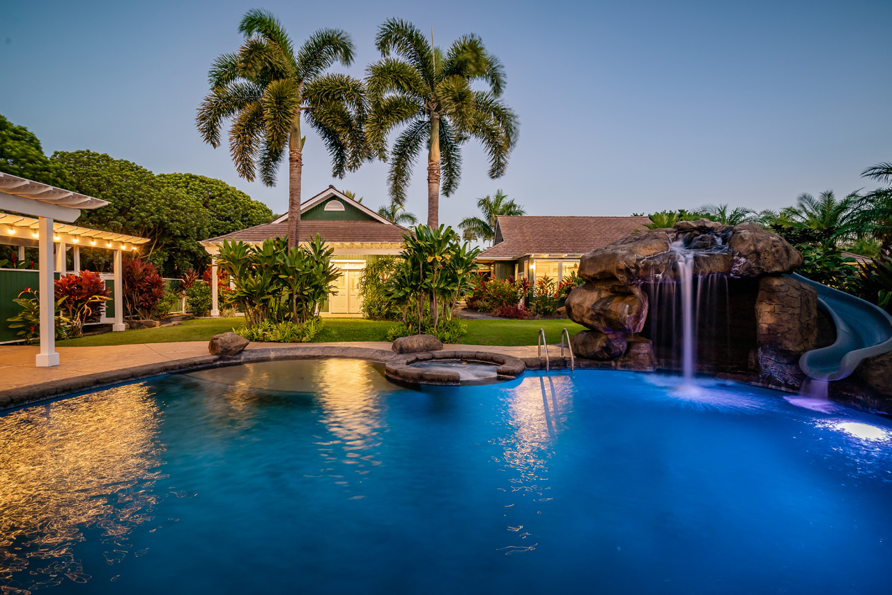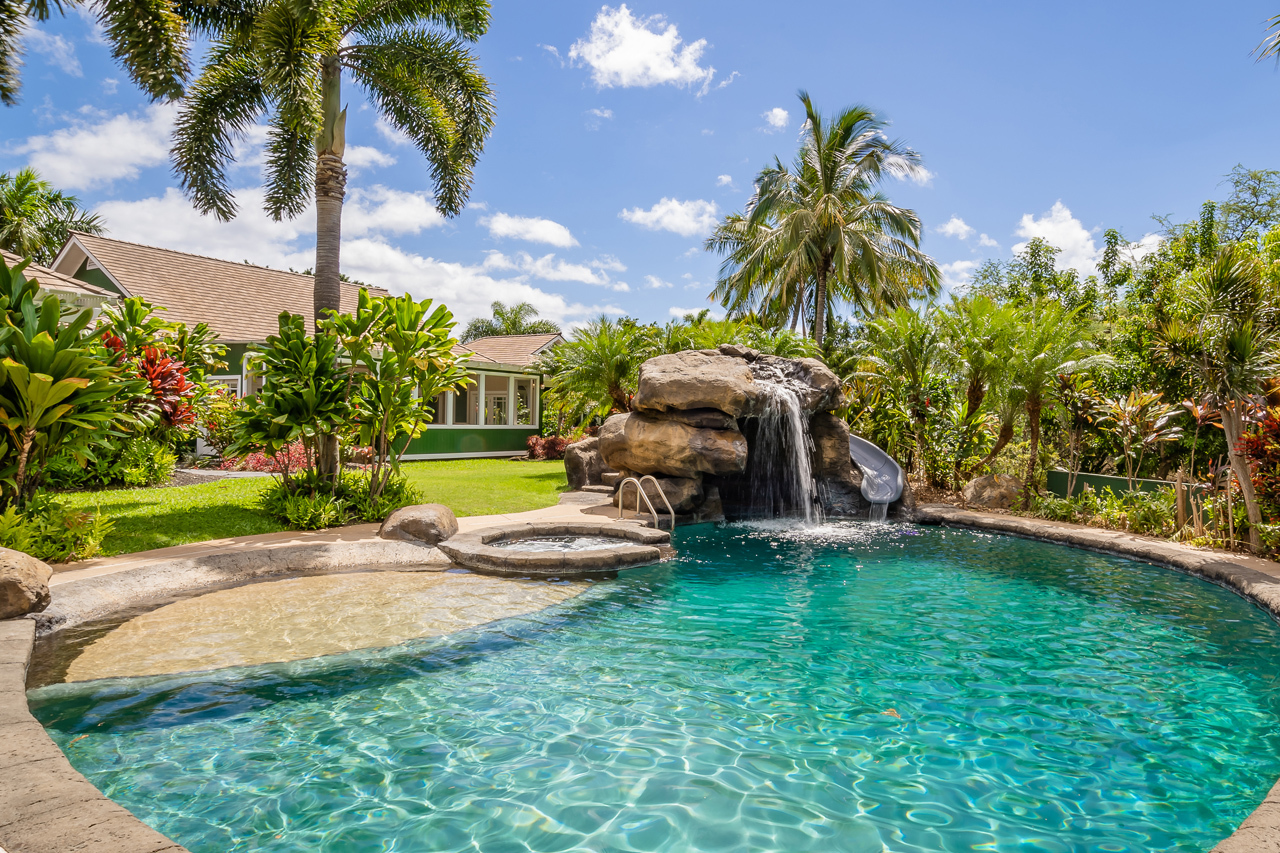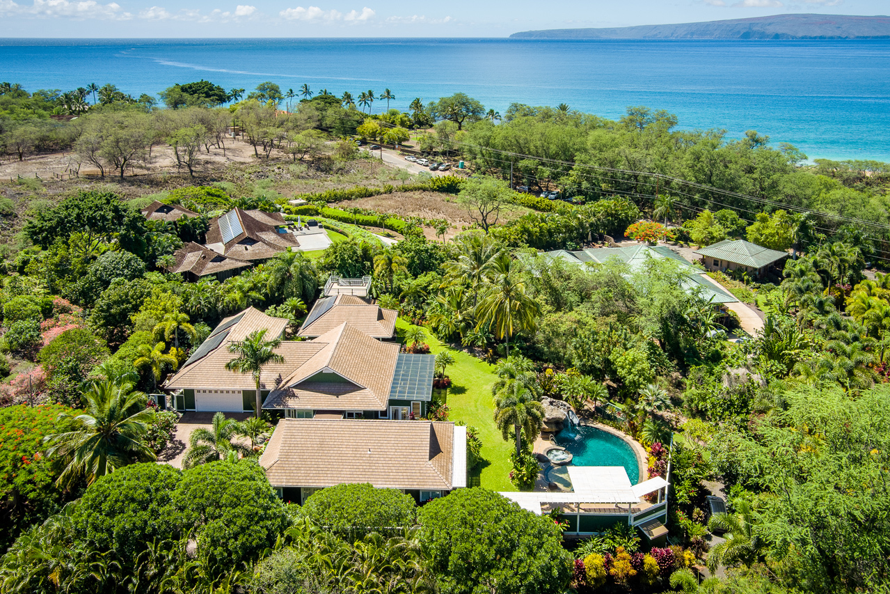 The Enchanting Emerald perfectly set in Magnificent Makena, Maui. A once in a lifetime opportunity to own in one of the most highly sought after locations on the island, a private gated enclave across the street from the golden sands of Big Beach, Makena! This legacy property exemplifies the ideal union of modern amenities with the charming architectural character of a historic Plantation-style home. Every inch of this nearly 1 acre estate has been thoughtfully designed to maximize comfort & convenience so you can live your ideal Hawaii lifestyle. Careful attention went into every detail of construction and design to create a 5 bedroom, 4.5 bathroom custom residence that seamlessly integrates into the native landscape for graceful indoor/outdoor living. The soothing sounds of the nearby waves enhance the ambiance of this most peaceful setting. Take a refreshing swim in the resort-style pool which has a custom-built waterfall with waterslide. Revel in majestic mountain views while lounging on the elevated relaxation deck or have some fun at the custom putting-green! The grand living room, with high 20-foot vaulted ceilings, is the inviting central hub which connects the different private wings of the home. Two spacious master suites, one on the South wing and one on the East wing, each feel like their own private oasis. The North wing has a family/entertainment room which connects 3 bedrooms and 2 bathrooms. Sliding glass doors off the living room connect to the West wing which is an elegant, 30-foot enclosed lanai with french doors. Interior features include a brand new A/C system, pine wood flooring, custom lighting, granite countertops, and top of the line high energy efficient appliances in the chef’s kitchen. Natural splendors outside include manicured gardens, mature fruit trees, and lush tropical landscaping, perfectly framed with extensive lava-rock walls.Â
