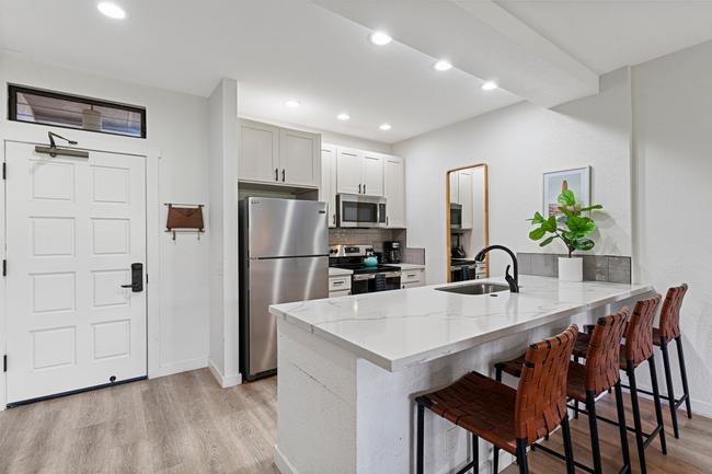Grand Champions 99 is a masterfully remodeled 2 bedroom condo with a spacious floor plan with 1,056 square feet of living area with lovely covered lanai space for enjoying the mountain and golf course views. This popular vacation condo in Wailea has already earned more than 100 FIVE-STAR reviews from guests! Updated in 2022 with new furniture, new luxury vinyl plank flooring, new kitchen with stainless steel appliances and quartz counters, and fully remodeled bathrooms. Ideal peaceful location with convenient quick access to the central community pool and nearby shops and restaurants.