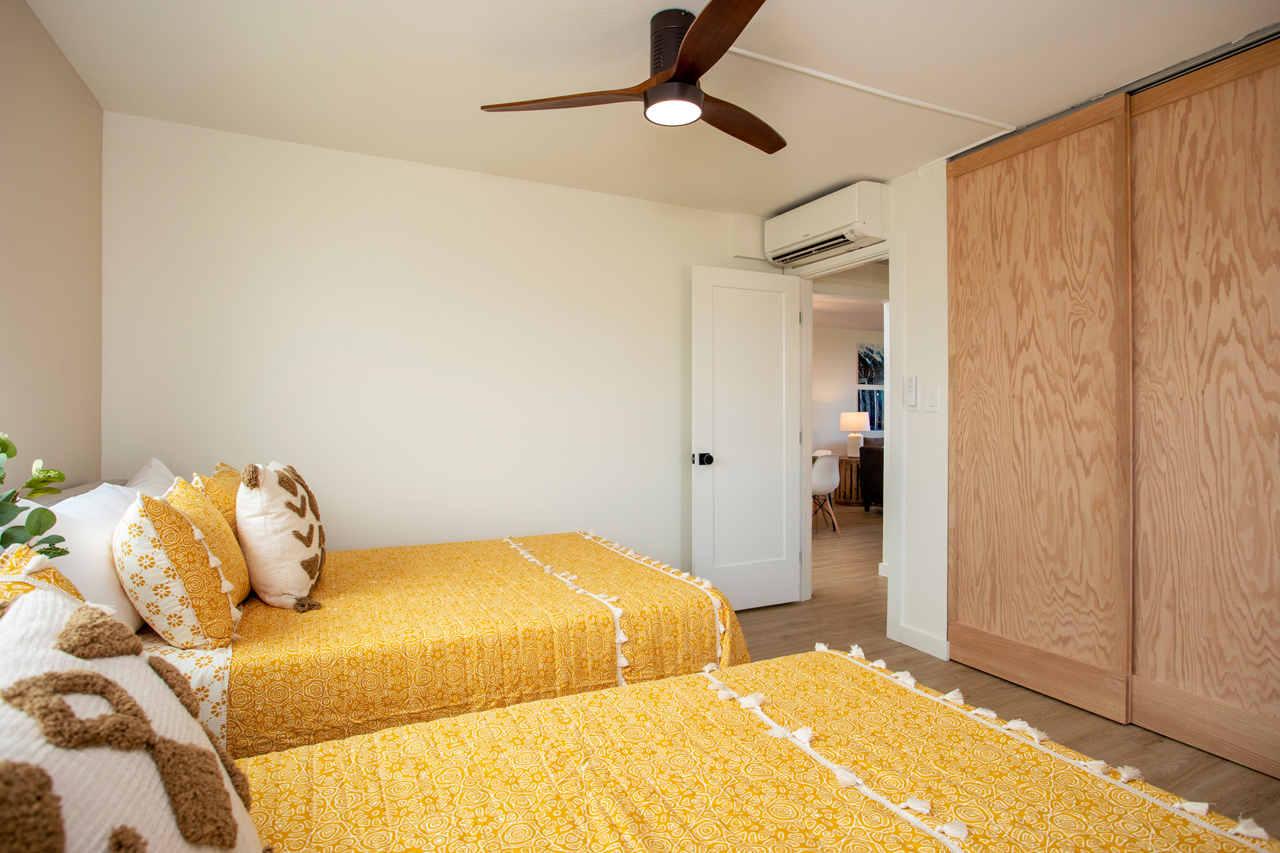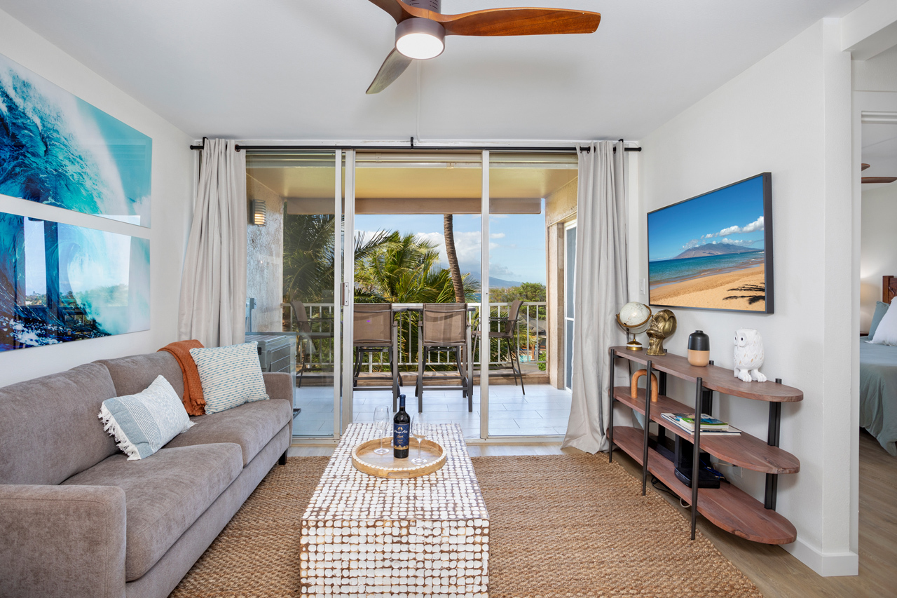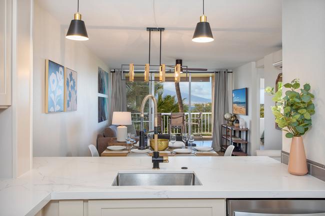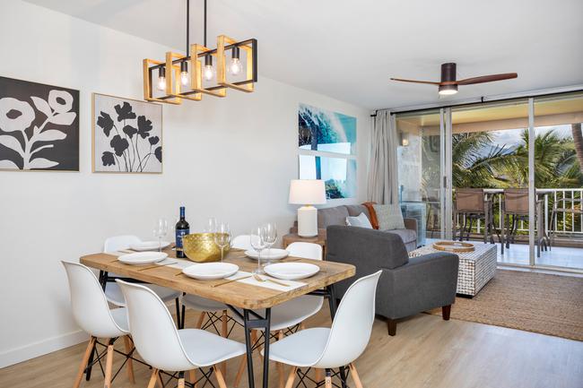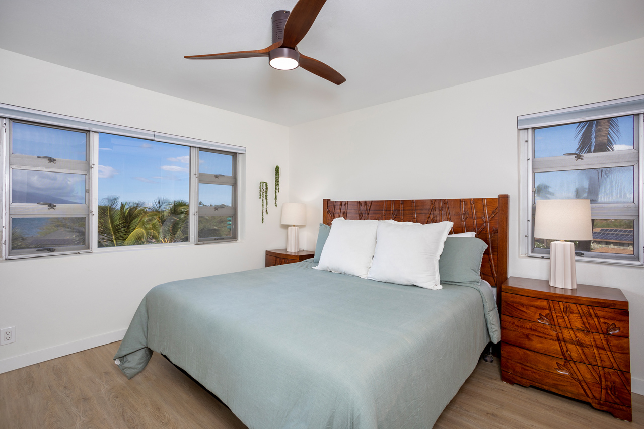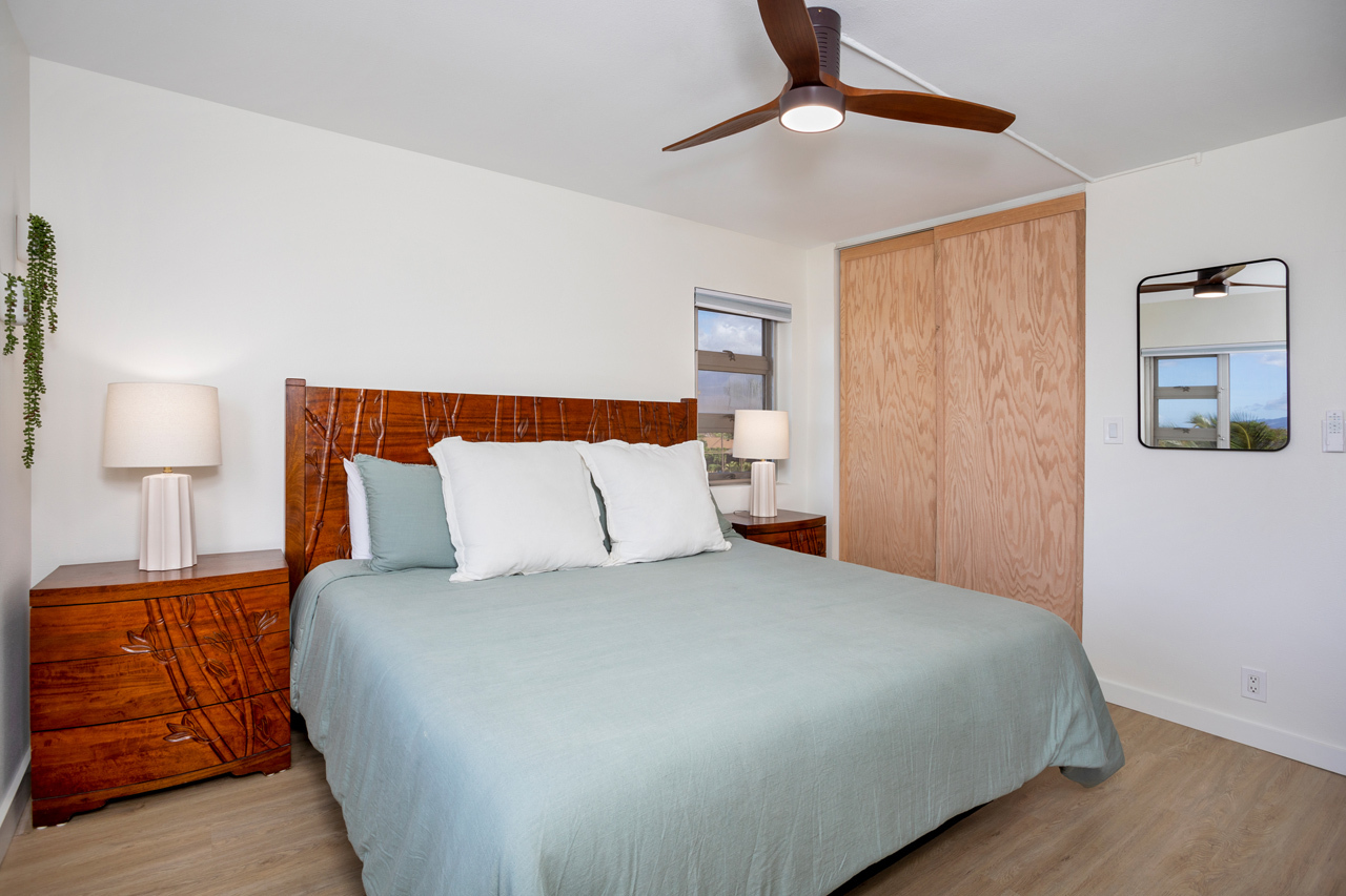 At Menehune Shores 501 you can savor ocean views, tropical breezes and quick access to the sandy beach all from the comfort of your spacious 2 bedroom finely appointed condo! This oceanfront Hotel zoned community is a popular vacation destination and Unit 501 offers an excellent location on the North side of the building for added privacy and relaxation in the shade. Because this is an end unit, both bedrooms have windows on two sides which is an added bonus! With a premium custom remodel in 2022, this modern and stylish unit boasts new furniture, light fixtures and fans, luxury vinyl plank flooring, beautifully updated kitchen with stainless steel appliances and quartz counters, and fully remodeled bathrooms. Immaculate and well maintained, this popular vacation condo has rave reviews from guests who love the ocean views, decor and convenient location. Energy efficient split AC in the living room and both bedrooms.