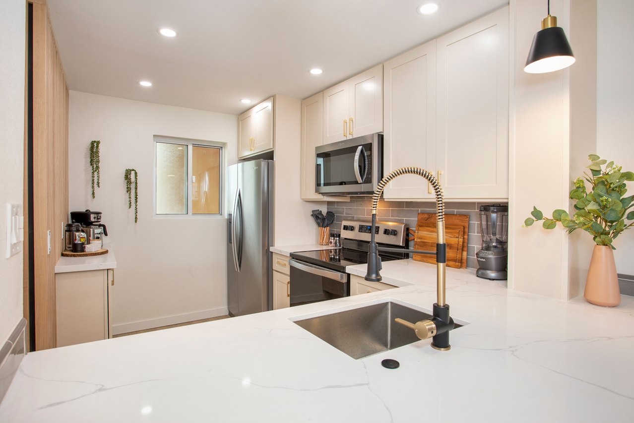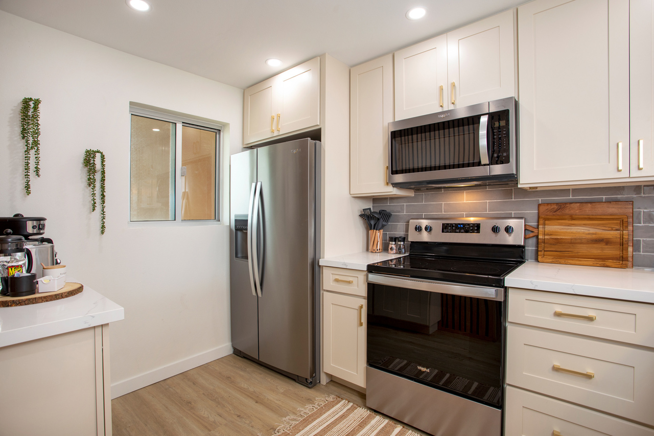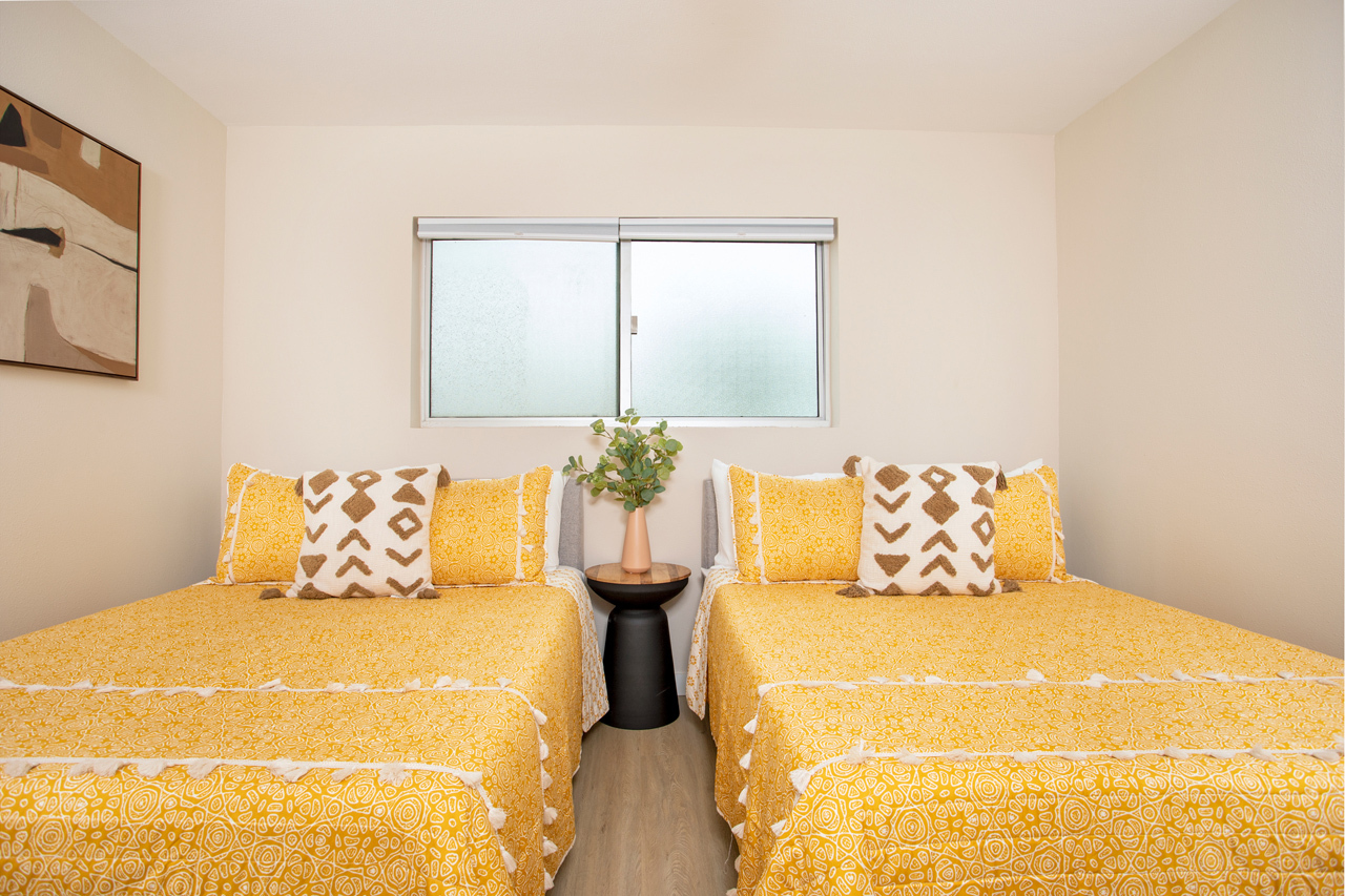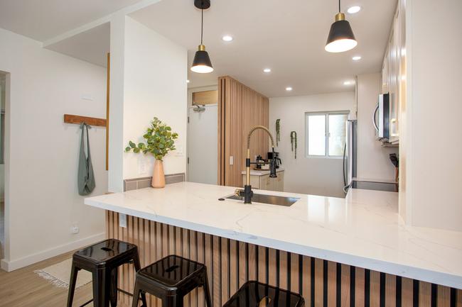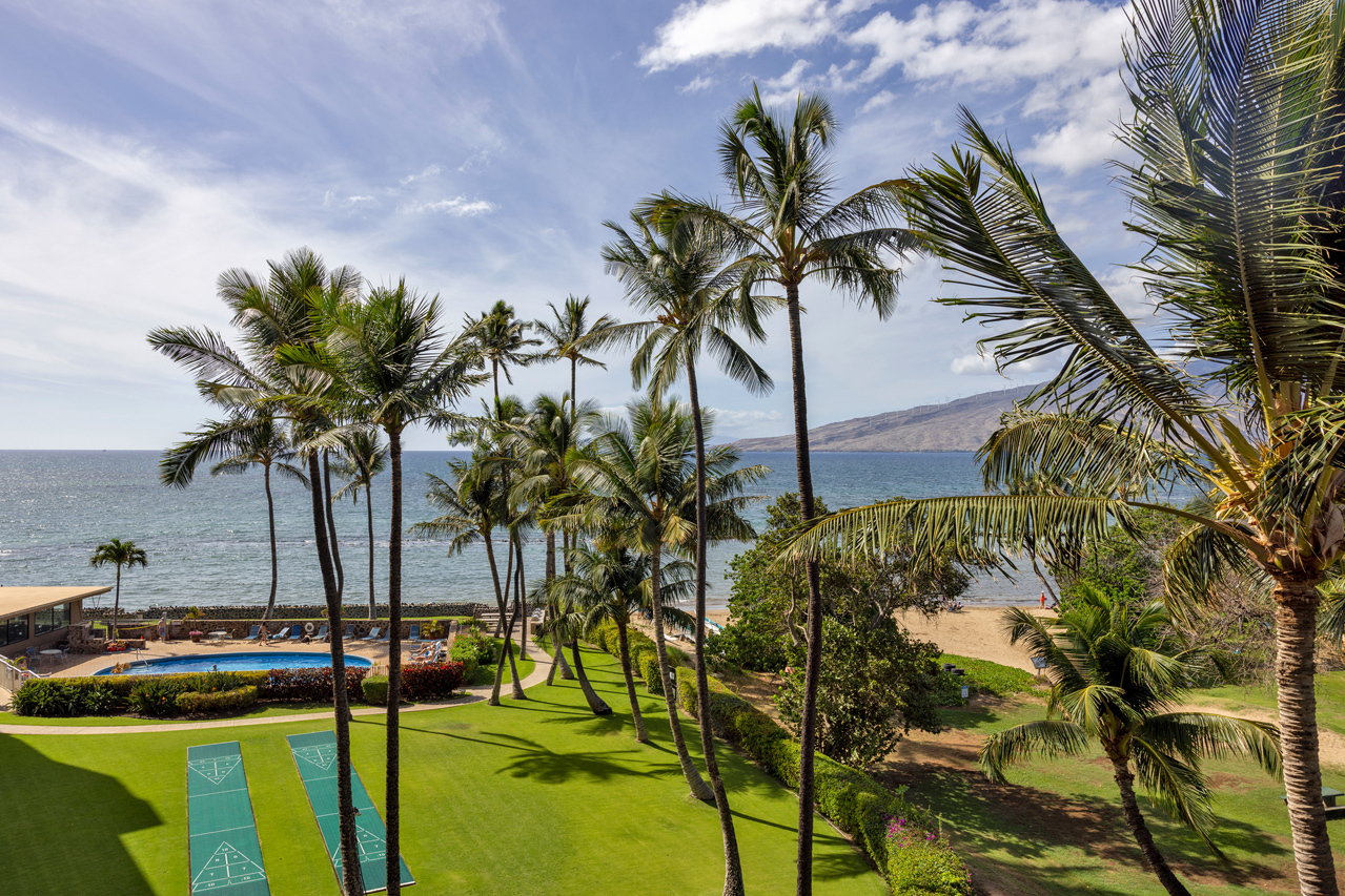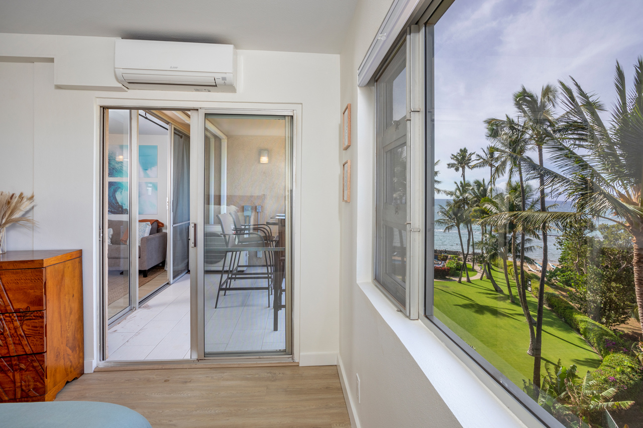 At Menehune Shores 501 you can savor ocean views, tropical breezes and quick access to the sandy beach all from the comfort of your spacious 2 bedroom finely appointed condo! This oceanfront Hotel zoned community is a popular vacation destination and Unit 501 offers an excellent location on the North side of the building for added privacy and relaxation in the shade. Because this is an end unit, both bedrooms have windows on two sides which is an added bonus! With a premium custom remodel in 2022, this modern and stylish unit boasts new furniture, light fixtures and fans, luxury vinyl plank flooring, beautifully updated kitchen with stainless steel appliances and quartz counters, and fully remodeled bathrooms. Immaculate and well maintained, this popular vacation condo has rave reviews from guests who love the ocean views, decor and convenient location. Energy efficient split AC in the living room and both bedrooms.