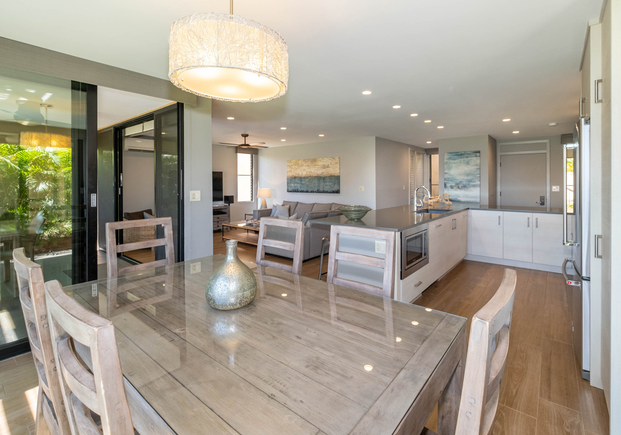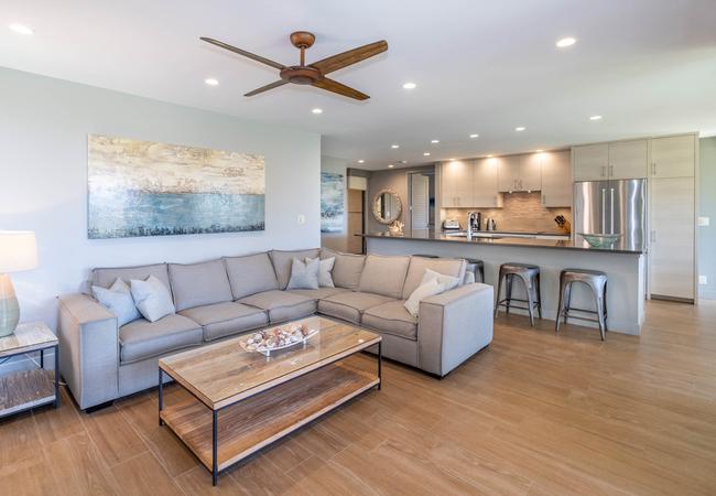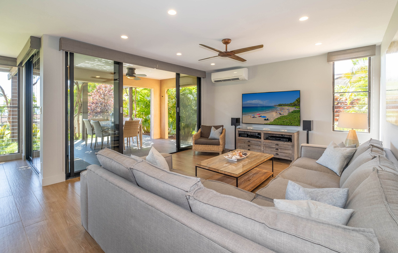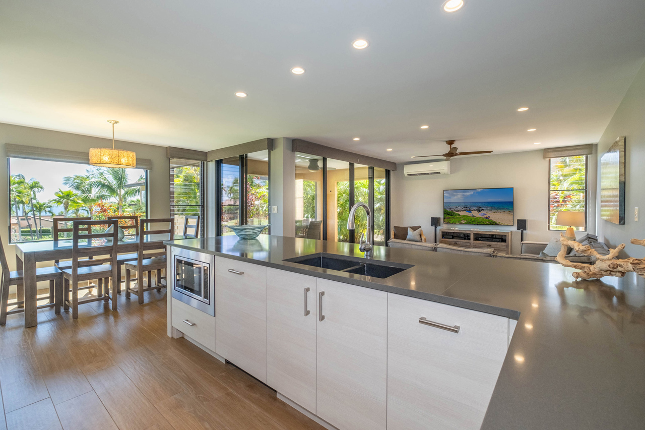 Absolutely stunning 2 bedroom Wailea Ekahi villa with every upgrade imaginable! The villa has been transformed through an extensive designer remodel, achieving a stunning and expansive modern aesthetic, illuminated with the tranquil hues of the seaside. Every detail has been meticulously curated in this luxurious renovation, making it an ideal sanctuary for a rejuvenating island getaway. Iconic properties such as this one rarely become available. This is the crown jewel of Ekahi. Nestled on the serene greenbelt, Ekahi 28A boasts an excellent location in the lower village. Step inside to discover a living space where perfection meets sophistication. The entire interior has been updated to the highest standards with a modern yet relaxed and comfortable design. No expense was spared in transforming this villa into a haven of luxury. The layout has been thoughtfully redesigned to enhance flow, functionality, and visual appeal. Impeccable quality is evident in every corner. The kitchen is a chef's dream, featuring new top-of-the-line appliances and premium finishes. The opulent primary suite boasts a king-sized bed, privacy curtains, an en-suite bathroom with a walk-in shower, and a secluded lanai. A spacious secondary primary suite offers two queen beds, privacy curtains, a private bathroom with a combined tub and shower, and a tranquil garden lanai exclusively for your enjoyment.The bathrooms have been transformed into spa-like retreats, featuring high-end fixtures and exquisite tile work. Stay cool and comfortable year-round with the new split AC system. Literally, every aspect of this villa has been professionally addressed and upgraded. It's being offered completely turnkey by the sellers, and ready for you to enjoy. Wailea Ekahi offers world-class amenities, including direct access to Keawakapu Beach, multiple pools, pickleball courts, edible landscaping, and meticulously manicured grounds. This is the epitome of island living at its finest.